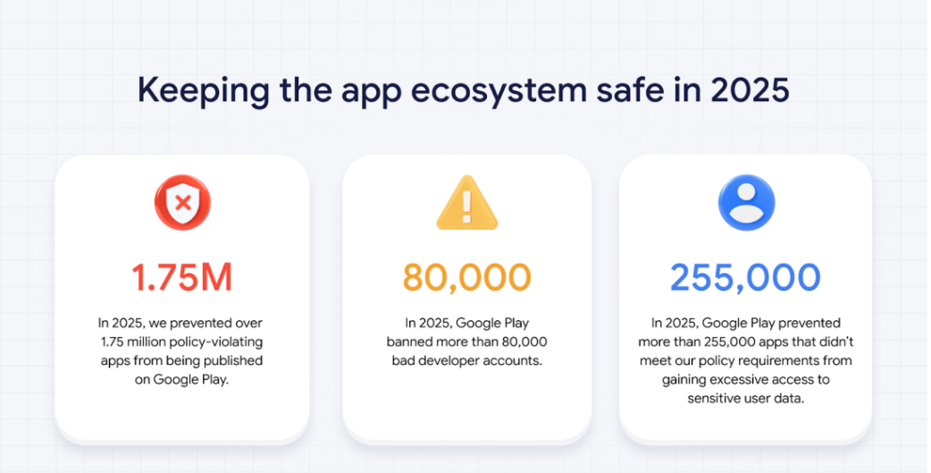In its latest Android app ecosystem safety report, Google said it prevented 1.75 million policy-violating apps from being published on Google Play in 2025, down from 2.36 million in 2024 and 2.28 million in 2023.