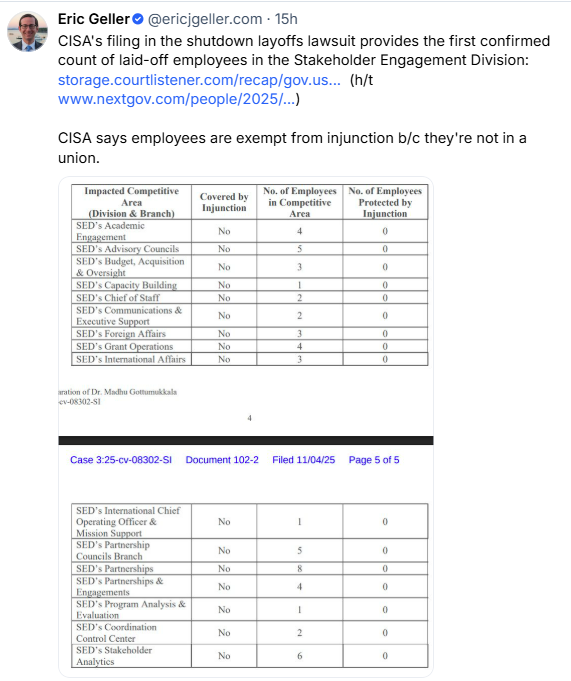 The injunction barred any layoffs since the Oct. 1 start of the shutdown, but applied only to “competitive areas”— the groupings of employees that agencies must create before engaging in RIFs — that contain members of one of the unions party to the lawsuit. Because CISA did not send layoff notices to any staffing groups that contained such union-represented workers, the agency argued it can proceed with the cuts.