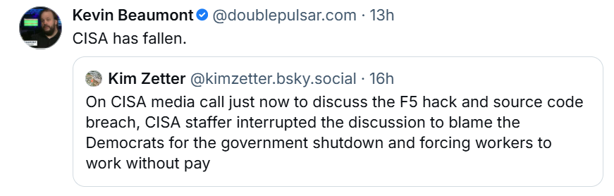 "I cannot speak for other departments and agencies. I'm unaware of their staffing levels as we continue to see the Democrats' refusal on the Hill to act," he told reporters. "The shutdown is forcing a lot of these folks to work without pay as nation states continue to intensify efforts to exploit Americans and our critical systems, and certainly think that that's an unacceptable and unnecessary strain on our nation's defenses." (Greg Otto / Cyberscoop, Margi Murphy, Patrick Howell O'Neill, and Jordan Robertson / Bloomberg, Jessica Lyons / The Register)
