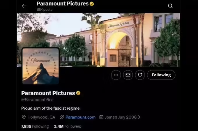 The official account for Paramount Pictures on X, the social network formerly known as Twitter, was seemingly compromised Tuesday — with someone rewriting the description in the account’s bio to read: “Proud arm of the fascist regime.”