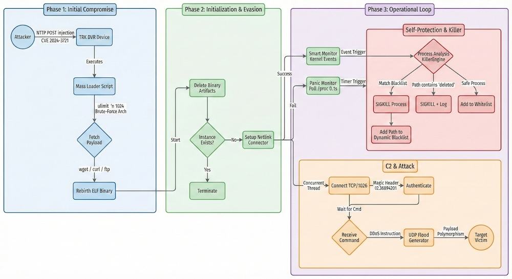 “Technically, it diverges from standard Mirai by utilizing Netlink kernel sockets for stealthy, event-driven process monitoring (replacing noisy filesystem polling), and employing payload polymorphism to evade static defenses.”