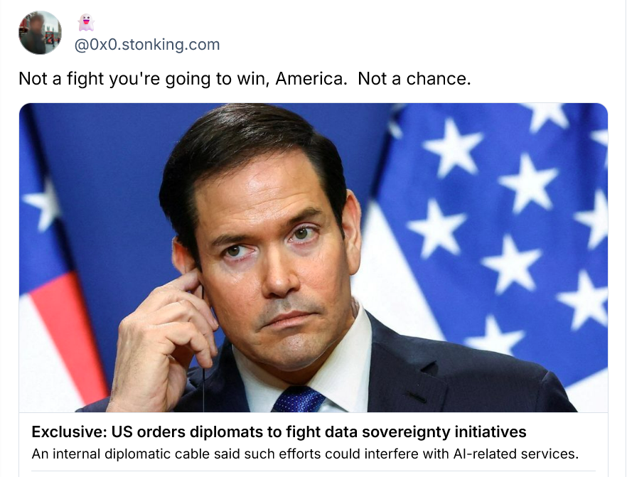 In a State Department cable dated February 18 and signed by US Secretary of State Marco Rubio, the Trump administration ordered US diplomats to lobby against attempts to regulate US tech companies' handling of foreigners' data.