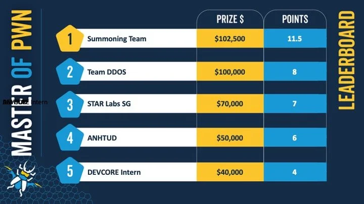 Summoning Team won a total of $102,500 during the first day of the competition and is at the top of the Master of Pwn leaderboard with 11.5 points. (Sergiu Gatlan / Bleeping Computer)