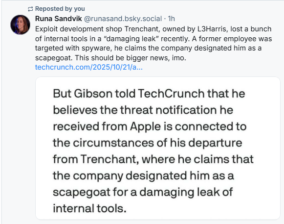 A developer, "Jay Gibson," who until recently built surveillance technologies for Western government hacking tools maker Trenchant, may be the first documented case of someone who builds exploits and spyware being targeted with spyware.