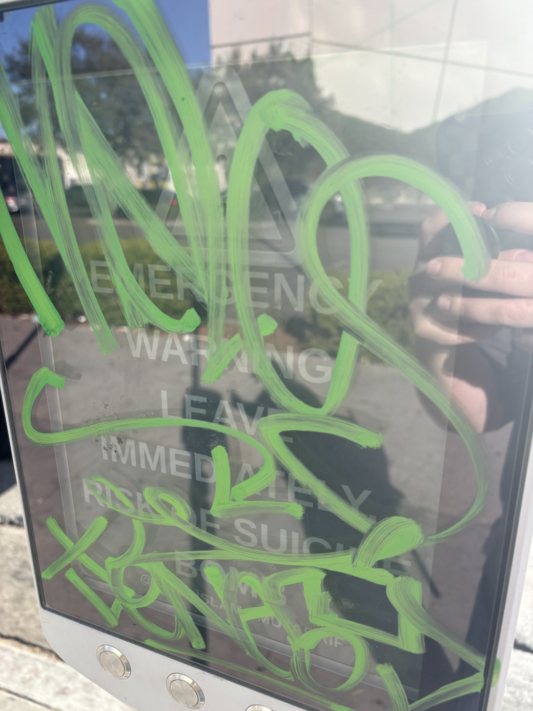 Photos showed one of the digital reader boards at a bus stop at 6th Street and Vermont Avenue displaying a message that read “EMERGENCY WARNING. LEAVE IMMEDIATELY. RISK OF SUICIDE BOMB.”