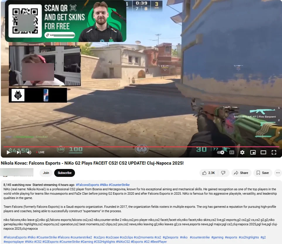 The security firm warns that threat actors impersonate professional CS2 players like S1mple, NiKo, and Donk in live streams on YouTube, promoting fake CS2 skins and cryptocurrency giveaways.
