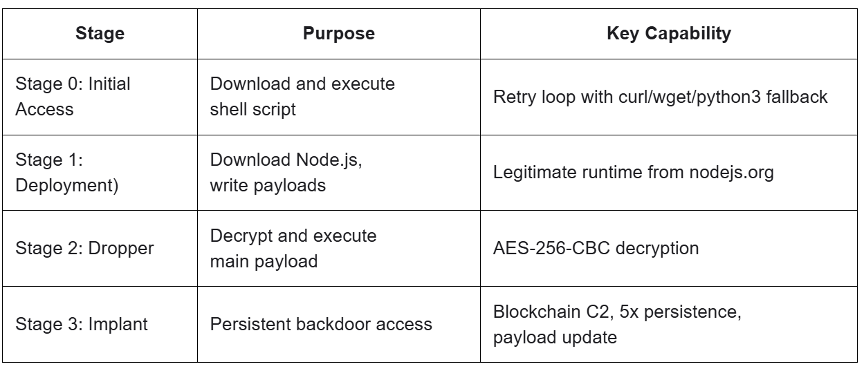 Sysdig highlights EtherRAT's mix of sophisticated features, including blockchain-based command-and-control (C2) communication, multi-layered Linux persistence, on-the-fly payload rewriting, and evasion using a full Node.js runtime.