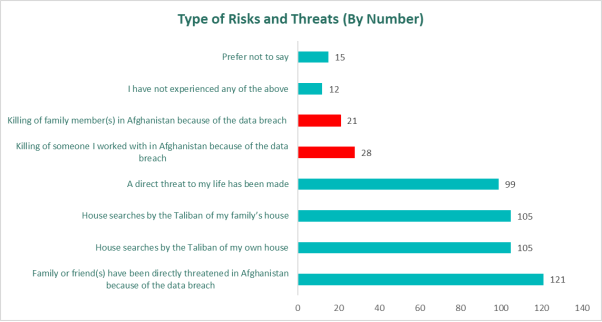 The research, submitted to the Commons defense select committee inquiry into the data breach, found that, of those surveyed, 200 of the 231 notified (87%) reported threats made to themselves or members of their families, while 99 (43%) reported a direct threat made to their life as a result of the data breach. A total of 121 (52%) said that the Taliban had threatened family or friends in Afghanistan.