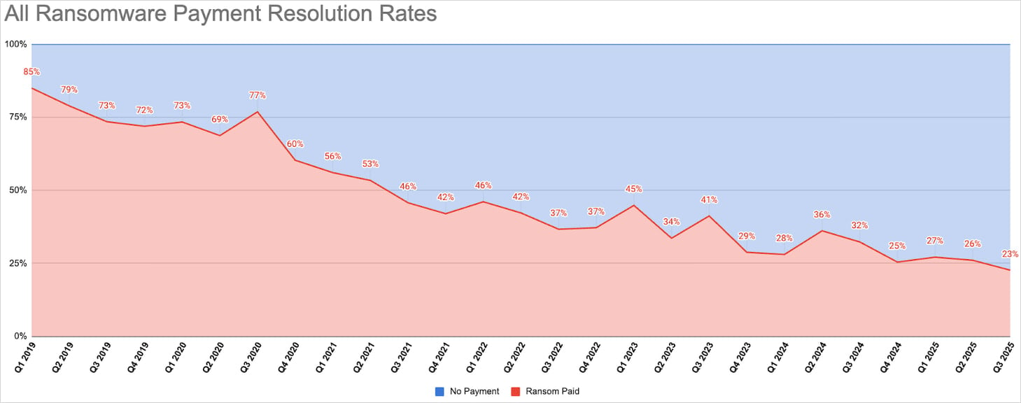 With some exceptions, the decline in payment resolution rates continues the trend that Coveware has observed for the past six years.