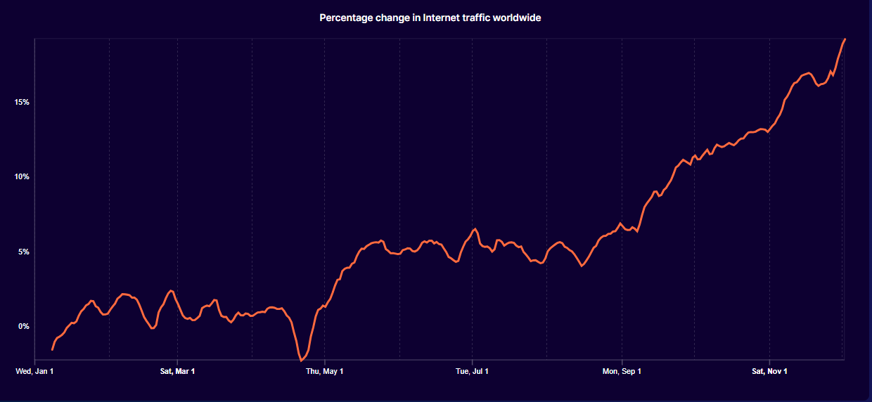 Cloudflare notes that internet traffic worldwide grew by almost a fifth, with the increases coming in fits and starts. In fact, traffic was somewhat flat through mid-April and even experienced a mysterious dip before bouncing back sharply to 5 percent growth during May.