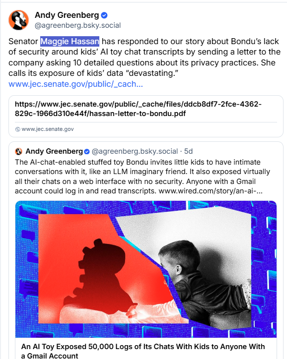 New Hampshire Democratic senator Maggie Hassan is demanding answers from AI toy company bondu, which is accused of exposing tens of thousands of children's private conversations.