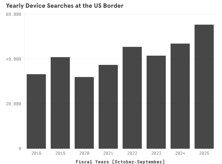 For the full fiscal year of 2025—running from October 2024 to the end of September 2025—border agents conducted around 55,424 searches of electronic devices. This is up from around the 47,000 searches that were completed during the government’s 2024 fiscal year.