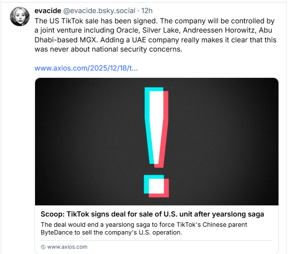 Upon closing, the USjoint venture "will operate as an independent entity with authority over US data protection, algorithm security, content moderation, and software assurance, while TikTok Global's US entities will manage global product interoperability and certain commercial activities, including e-commerce, advertising, and marketing," (Sara Fischer / Axios)