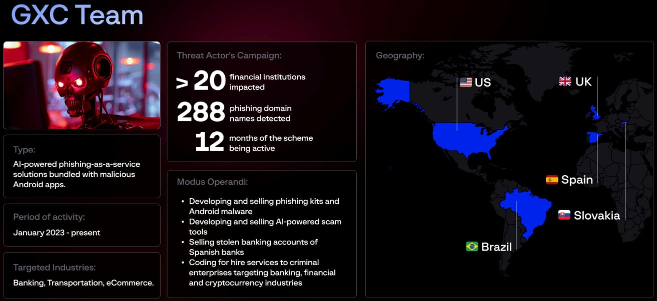 The GXC Team operated a crime-as-a-service (CaaS) platform offering AI-powered phishing kits, Android malware, and voice-scam tools via Telegram and a Russian-speaking hacker forum.