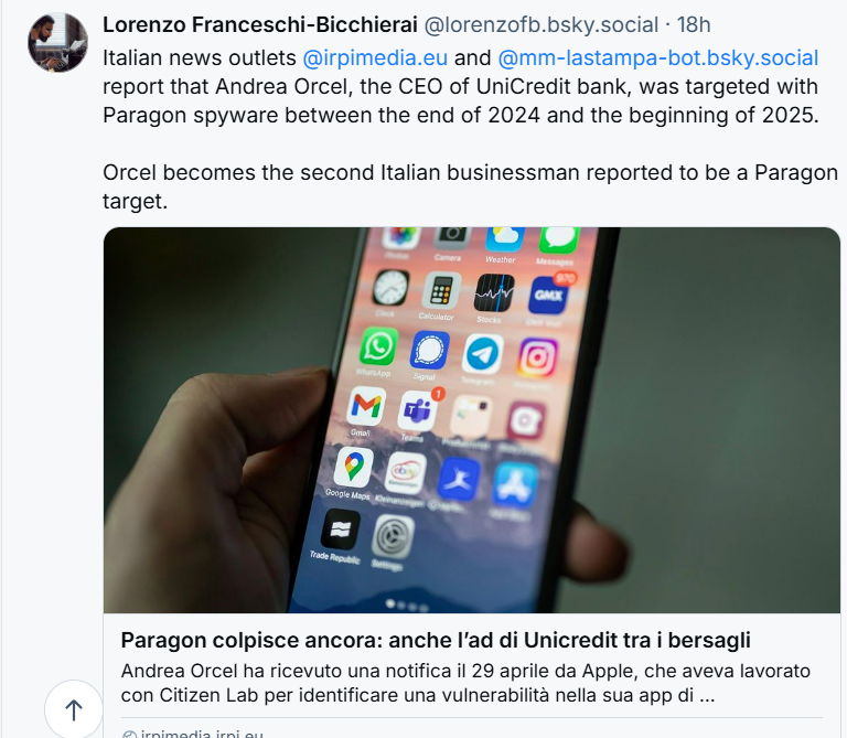 Andrea Orcel, CEO of UniCredit bank, received a notification on April 29 from Apple, which had worked with Citizen Lab, that he was targeted with Graphite spyware from the Israeli company Paragon Solutions.