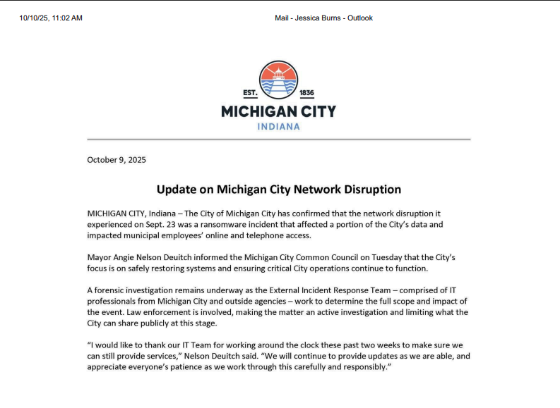 Michigan City, Indiana, officials are working to restore their systems after a ransomware incident on September 23.