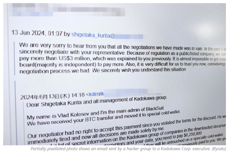 Russian ransomware group BlackSuit e-mailed multiple executives of Japanese publisher Kadokawa Corp. that it had received $2.98 million in cryptocurrency from the firm after a massive cyberattack hit it in June.