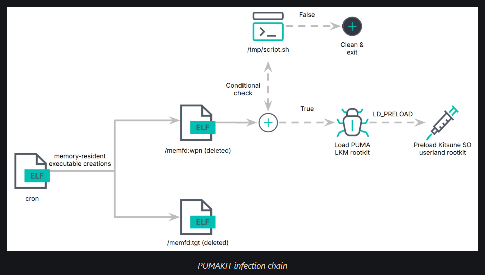 Pumakit employs a multi-stage infection process starting with a dropper named 'cron,' which executes embedded payloads ('/memfd:tgt' and '/memfd:wpn') entirely from memory.