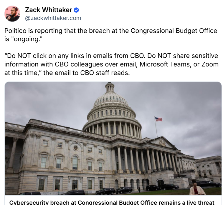 A cybersecurity breach discovered last week affecting the Congressional Budget Office is now considered “ongoing,” threatening both incoming and outgoing correspondence around Congress’s nonpartisan scorekeeper.